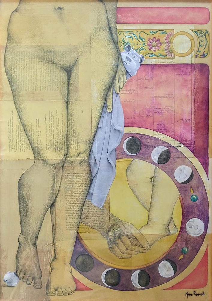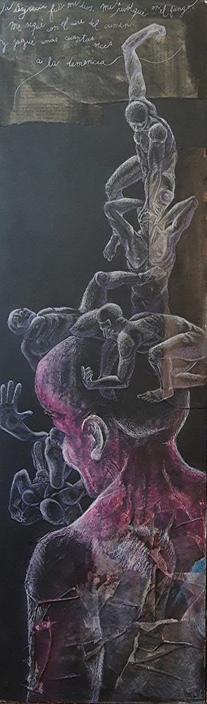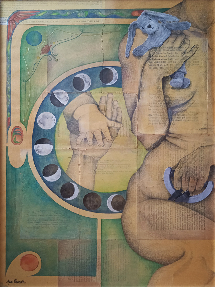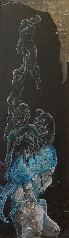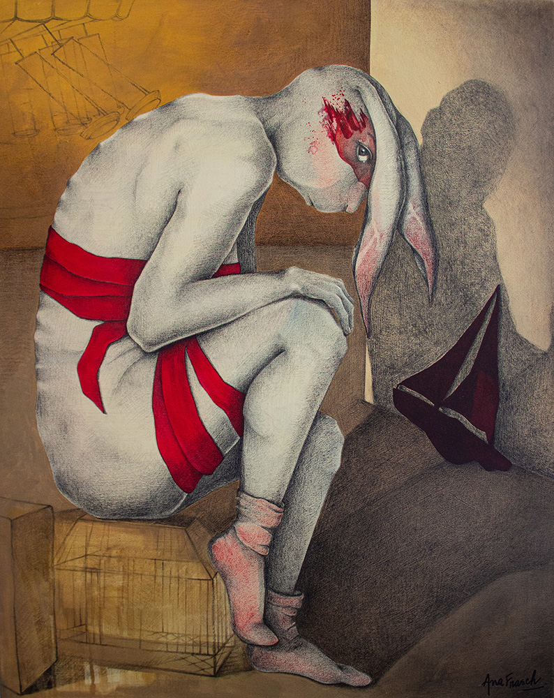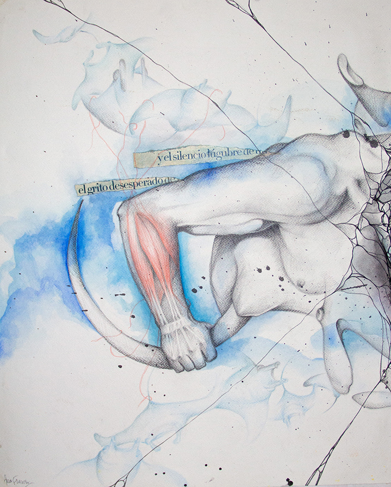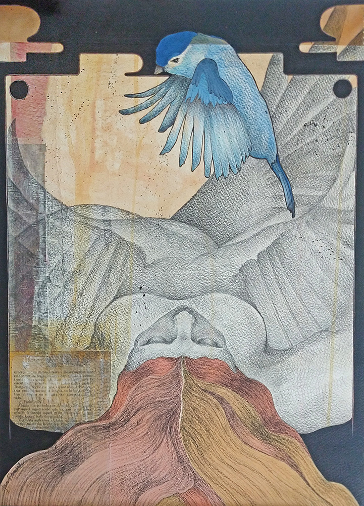 Fondos texturados y figuras se funden en un mismo mensaje. Mi trabajo artístico se concentra en el dibujo, el lápiz completa mis manos como una extensión natural. El color se genera como acompañamiento tanto en acuarela o acrílico, alternando superficies densas de materia y livianas. Las marcas de mi infancia pisan fuerte en mi memoria y sin pensarlo fluyen en el papel los vestigios de esos recuerdos. La primera etapa de mi obra tiene que ver con el sentir, una exploración de emociones a través de diferentes ciclos. Se conjugan en ellas varias capas que ahondan en esa exploración y llevan a varios niveles de lectura unificando textos, dibujos de mis hijos y papeles heredados de tiempos pasados en un collage de fondo. Cada una de las piezas es un escalón de mi historia. La segunda parte cambia el rumbo tanto en materialidad como en su paleta de color. Comienzo una indagación sobre la angustia y el anhelo provocados por el quiebre de aquellos sentimientos explorados anteriormente. La vivencia personal por el camino de la ausencia marca la ruptura de lo bello. Intento mantener un espíritu romántico, dentro de un lenguaje simbólico, apropiándome sutilmente de lo surreal. De una estética teñida de pasado plasmo en mis obras mi historia, desafiando los límites del figurativismo, danzando entre realidad y ficción. Anuncio y revelo a modo de denuncia la fragilidad humana, donde la gobernabilidad de la razón pierde poder frente al desconcierto. Las figuras traslúcidas hablan de inestabilidad, de una materia fugaz y vulnerable. La debilidad de la mente, la muerte de la cordura apenas se atraviesa el umbral de la estabilidad emocional, la vacilación entre lo sensato y la perdida de sentido sirven de inspiración y motivación. Cada una de mis obras habla de mí, de mis recuerdos, de mis faltas, de mis tesoros, todo envuelto en un simbolismo oscuro de color brumado, como en un sueño perdido en el tiempo.