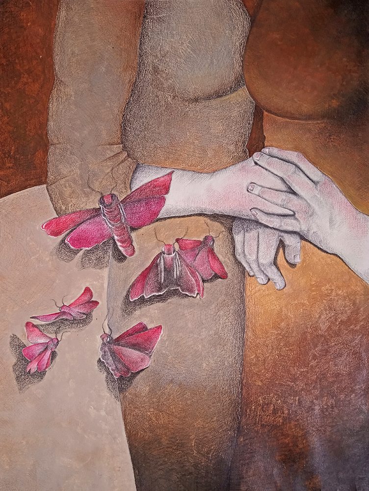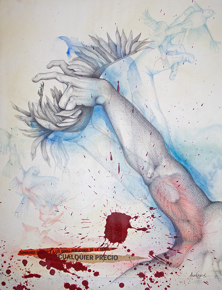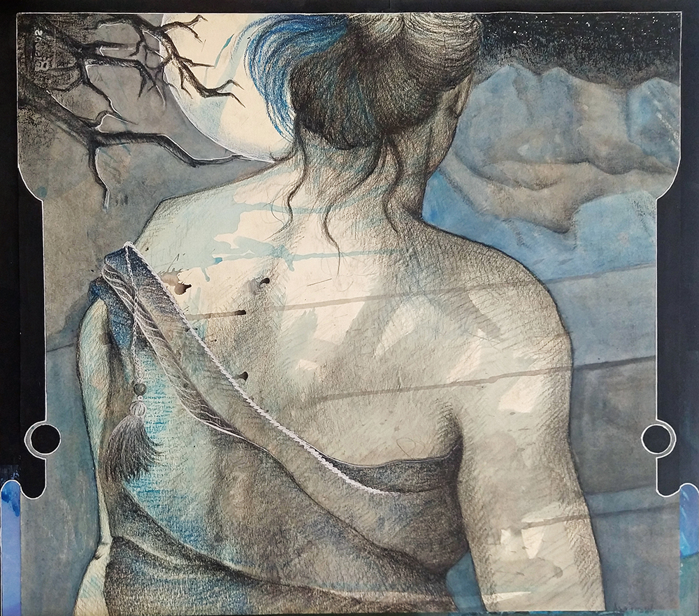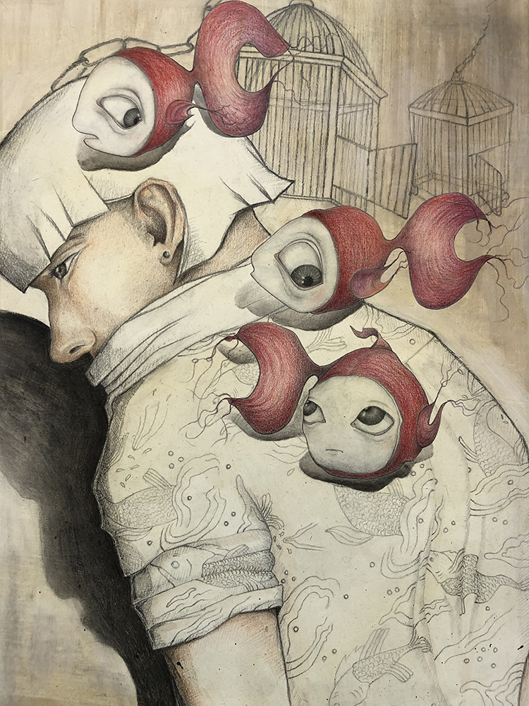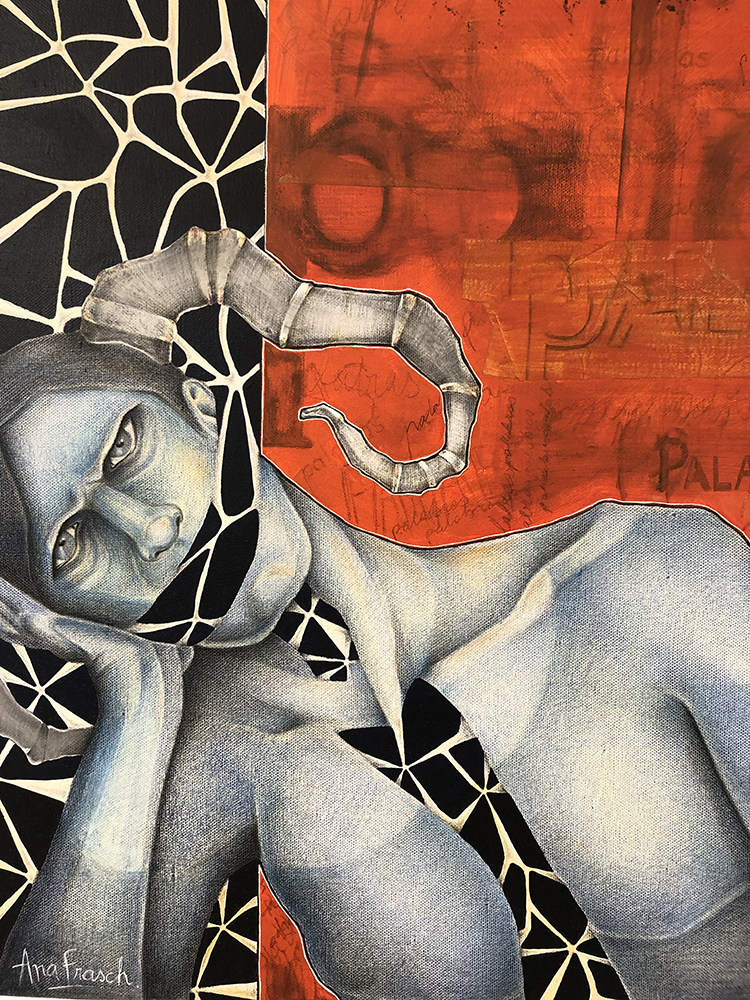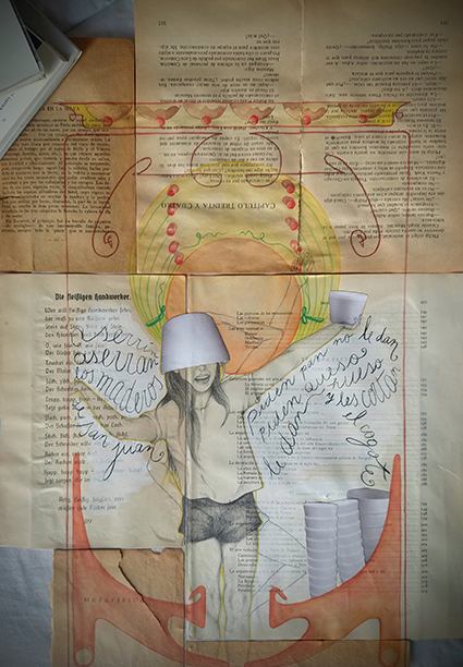 Fondos texturados y figuras se funden en un mismo mensaje. Mi trabajo artístico se concentra en el dibujo, el lápiz completa mis manos como una extensión natural. El color se genera como acompañamiento tanto en acuarela o acrílico, alternando superficies densas de materia y livianas. Las marcas de mi infancia pisan fuerte en mi memoria y sin pensarlo fluyen en el papel los vestigios de esos recuerdos. La primera etapa de mi obra tiene que ver con el sentir, una exploración de emociones a través de diferentes ciclos. Se conjugan en ellas varias capas que ahondan en esa exploración y llevan a varios niveles de lectura unificando textos, dibujos de mis hijos y papeles heredados de tiempos pasados en un collage de fondo. Cada una de las piezas es un escalón de mi historia. La segunda parte cambia el rumbo tanto en materialidad como en su paleta de color. Comienzo una indagación sobre la angustia y el anhelo provocados por el quiebre de aquellos sentimientos explorados anteriormente. La vivencia personal por el camino de la ausencia marca la ruptura de lo bello. Intento mantener un espíritu romántico, dentro de un lenguaje simbólico, apropiándome sutilmente de lo surreal. De una estética teñida de pasado plasmo en mis obras mi historia, desafiando los límites del figurativismo, danzando entre realidad y ficción. Anuncio y revelo a modo de denuncia la fragilidad humana, donde la gobernabilidad de la razón pierde poder frente al desconcierto. Las figuras traslúcidas hablan de inestabilidad, de una materia fugaz y vulnerable. La debilidad de la mente, la muerte de la cordura apenas se atraviesa el umbral de la estabilidad emocional, la vacilación entre lo sensato y la perdida de sentido sirven de inspiración y motivación. Cada una de mis obras habla de mí, de mis recuerdos, de mis faltas, de mis tesoros, todo envuelto en un simbolismo oscuro de color brumado, como en un sueño perdido en el tiempo.