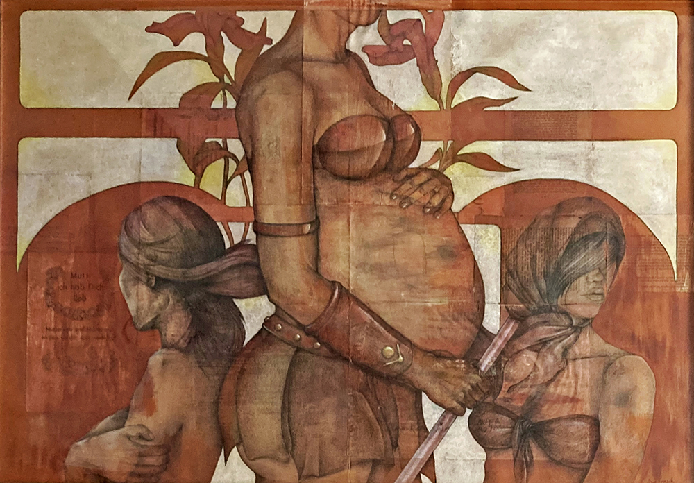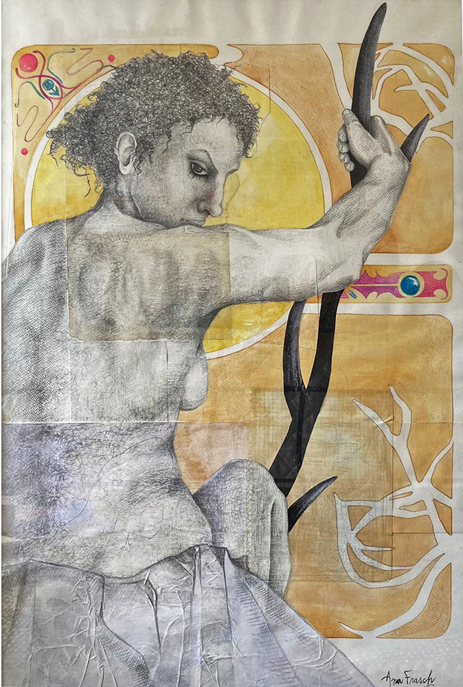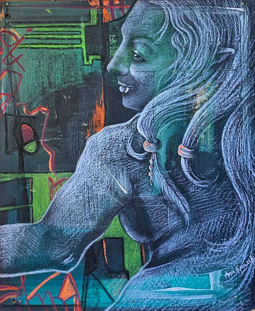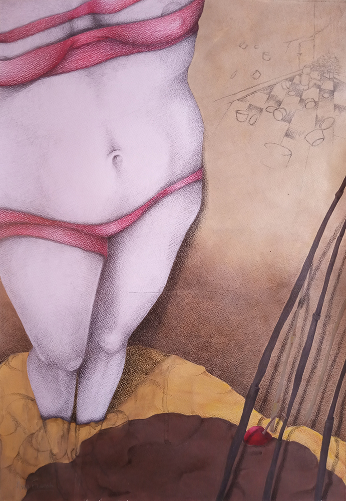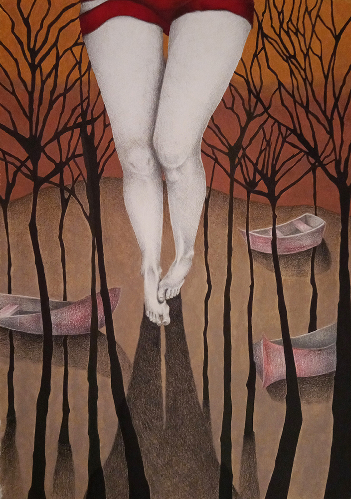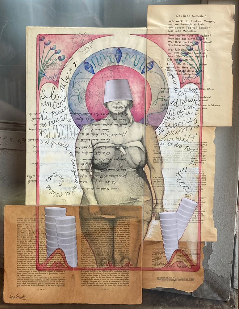 Fondos texturados y figuras se funden en un mismo mensaje. Mi trabajo artístico se concentra en el dibujo, el lápiz completa mis manos como una extensión natural. El color se genera como acompañamiento tanto en acuarela o acrílico, alternando superficies densas de materia y livianas. Las marcas de mi infancia pisan fuerte en mi memoria y sin pensarlo fluyen en el papel los vestigios de esos recuerdos. La primera etapa de mi obra tiene que ver con el sentir, una exploración de emociones a través de diferentes ciclos. Se conjugan en ellas varias capas que ahondan en esa exploración y llevan a varios niveles de lectura unificando textos, dibujos de mis hijos y papeles heredados de tiempos pasados en un collage de fondo. Cada una de las piezas es un escalón de mi historia. La segunda parte cambia el rumbo tanto en materialidad como en su paleta de color. Comienzo una indagación sobre la angustia y el anhelo provocados por el quiebre de aquellos sentimientos explorados anteriormente. La vivencia personal por el camino de la ausencia marca la ruptura de lo bello. Intento mantener un espíritu romántico, dentro de un lenguaje simbólico, apropiándome sutilmente de lo surreal. De una estética teñida de pasado plasmo en mis obras mi historia, desafiando los límites del figurativismo, danzando entre realidad y ficción. Anuncio y revelo a modo de denuncia la fragilidad humana, donde la gobernabilidad de la razón pierde poder frente al desconcierto. Las figuras traslúcidas hablan de inestabilidad, de una materia fugaz y vulnerable. La debilidad de la mente, la muerte de la cordura apenas se atraviesa el umbral de la estabilidad emocional, la vacilación entre lo sensato y la perdida de sentido sirven de inspiración y motivación. Cada una de mis obras habla de mí, de mis recuerdos, de mis faltas, de mis tesoros, todo envuelto en un simbolismo oscuro de color brumado, como en un sueño perdido en el tiempo.